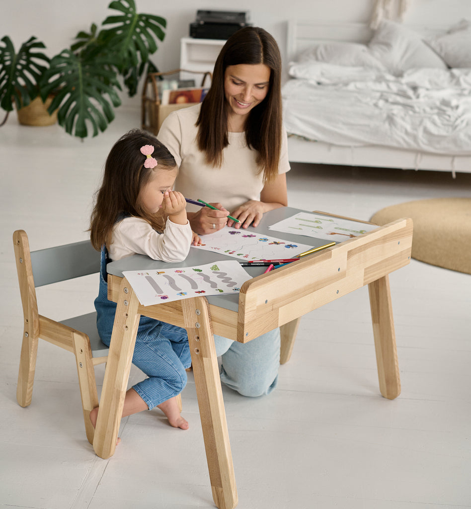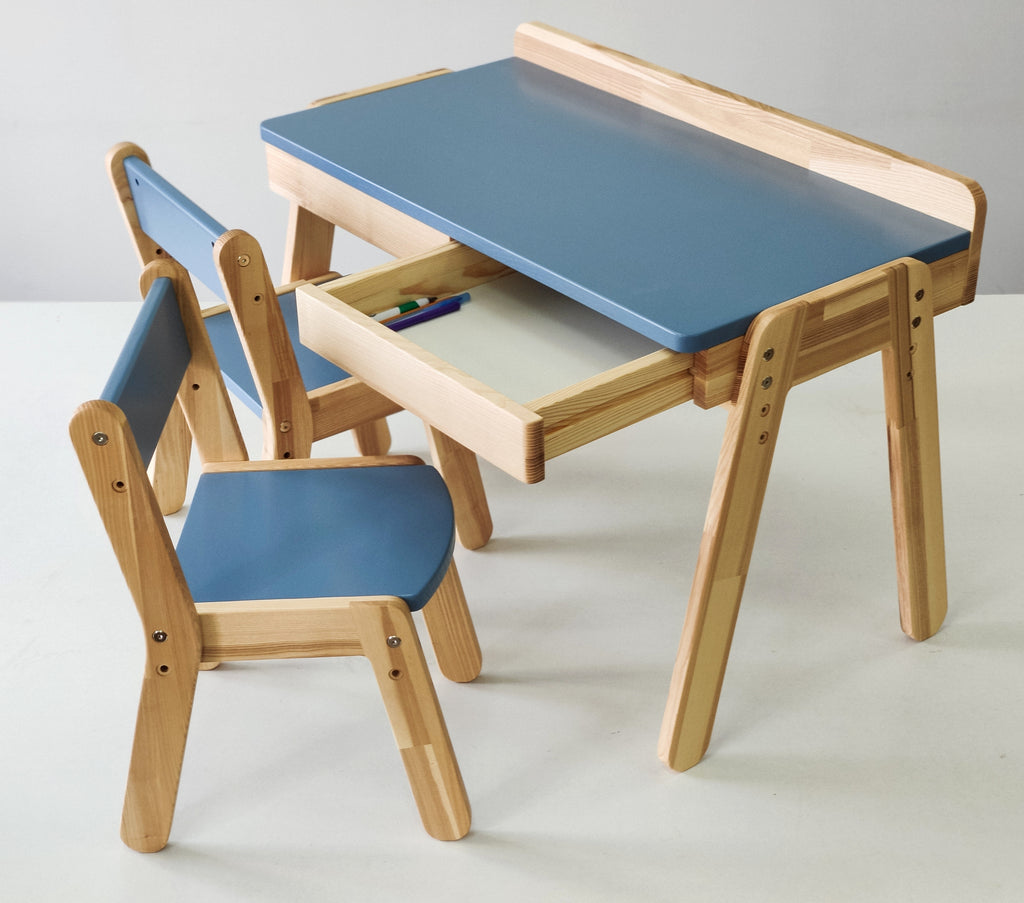 Wooden Adjustable Kids Desk and Two Chairs Set Ash Wood.