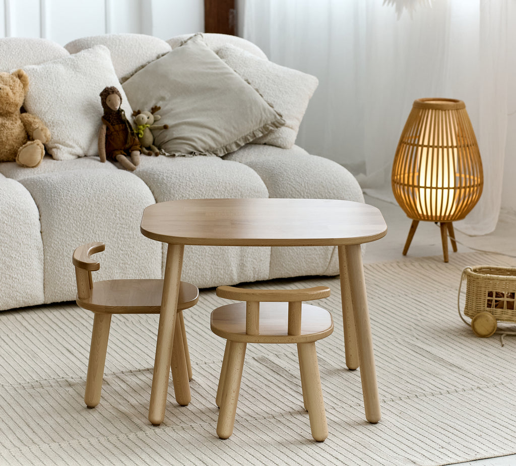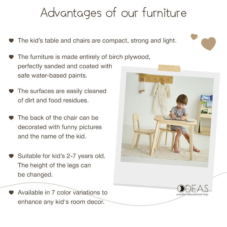 The importance of having furniture that is specifically designed for kids cannot be emphasized enough in today's world. While the market is flooded with endless options for adults, it is crucial to ensure that children have access to furniture that is tailored to their needs and size. It not only promotes their physical health but also enhances their mental well-being.Gone are the days when children had to struggle with oversized chairs and tables, making it uncomfortable for them to carry out simple tasks such as drawing or playing. However, this problem has been conveniently resolved. A set comprises a wooden table and two chairs, which is perfect for children starting from the age of two years old. The use of natural materials ensures that it is safe and easy to assemble while also ensuring a smooth finish. In addition, there are no sharp edges or corners, making it child-friendly and safe.Investing in a suitable furniture set for your child not only makes life easier but also contributes significantly towards their development and growth. Prioritize comfort and safety by providing children with appropriate furniture options.
