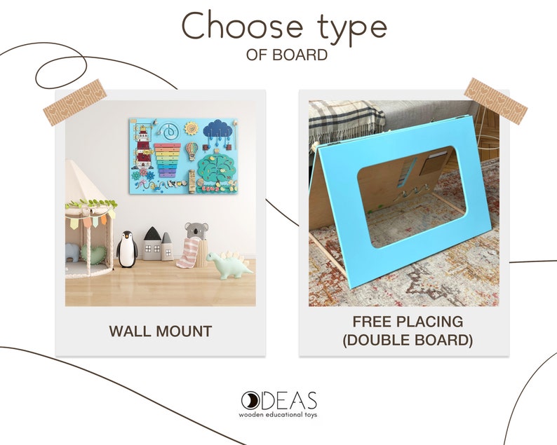The busy board has hinges for mounting on the wall. Be sure to fix it on the wall. Do not leave the child playing with an unfixed Busy Board. You can also order this activity board with a stable leg and place it anywhere in the house!